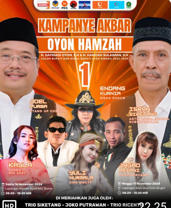 Untuk diketahui, adapun Artis yang akan tampil di Kampanye Akbar Oyon Hamzah itu, adalah Kayla Juara 1 KDI 2022. Yuli Nurmala, DMD MNCTV. Jagad Ariani, Host/Penyanyi. Joel Purba, Stand Up Comedy. Endang Kurnia, Mbah Dukun, dan Isran Siketang Artis lokal Singkil Subulussalam.