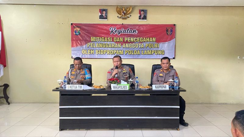Bid Propam Polda Lampung melaksanakan kegiatan mitigasi dan pencegahan pelanggaran anggota Polri bersama Bid Dokkes Polda Lampung terhadap personel Polres Way Kanan dan Jajaran di Aula Adhi Pradana Polres Way Kanan. Rabu (26/02/2025).