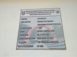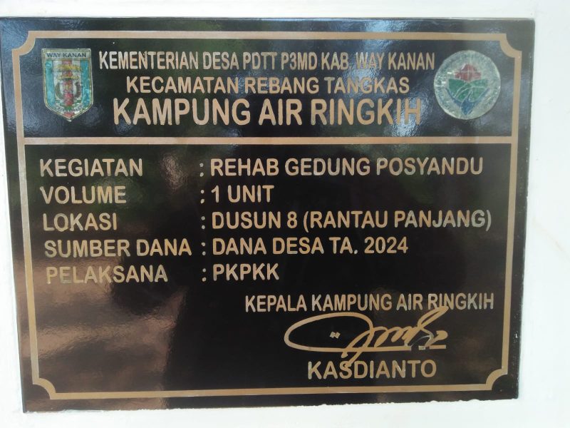 Terpampang jelas di papan plang informasi bahwa anggaran perehapan gedung posyandu menggunakan anggaran Dana desa,Letak perehapan gedung posyandu tersebut berlokasi di kampung air ringkih dusun 08 rantau jaya kec rebang tangkas Kab. way kanan dengan biaya perehapan sebesar RP. 174.051.300 ( seratus tujuh puluh empat juta lima puluh satu ribu tiga ratus rupiah)