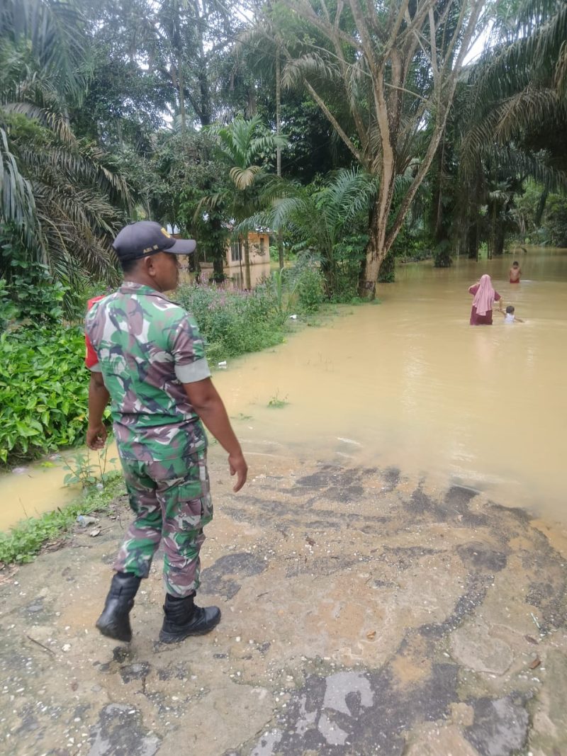 Bapak babinsa (Serda ARI WALUYO)  memantau langsung ke titik lokasi banjir. Menyampaikan