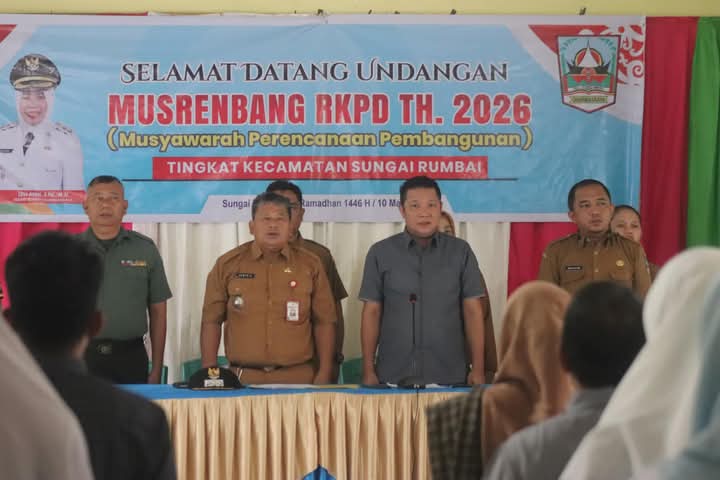 Kecamatan Sungai Rumbai gelar Musyawarah Perencanaan Pembangunan (Musrembang) Rencana Kerja Pemerintah Daerah (RKPD) Tahun 2026, musrenbang ini dihadiri langsung oleh Ketua DPRD Kabupaten Dharmasraya Jemi Hendra di Aula Kantor Camat Sungai Rumbai. Senin,(10/03/2025).