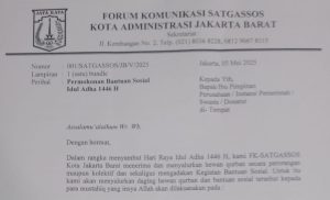 Menjelang Hari Raya Idul Adha 1446 H (Kurban 2025), masyarakat dan para pengusaha di Jakarta Barat dihebohkan dengan beredarnya surat permohonan sumbangan hewan kurban yang mengatasnamakan Forum Komunikasi Satgassos (FK-SATGASSOS) lengkap dengan kop dan stempel bertuliskan Suku Dinas Sosial Jakarta Barat.