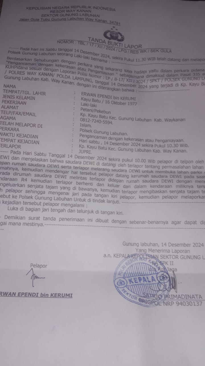 Korban Atas Nama Erwan efendi yang juga Anggota Gerakan Rakyat Indonesia Bersatu. (GRIB) Kabupaten waykanan, langsung melaporkan kejadian tersebut ke Polsek Gunung Labuhan. Yang Didampingi lansung oleh Ketua Dan Anggota DPC Grib jaya kabupaten waykanan.