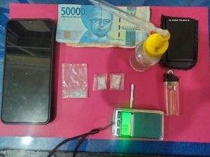 Dari hasil penggeledahan di lokasi, petugas menemukan tiga plastik bening berisi butiran kristal bening yang diduga sabu, satu unit timbangan digital, satu unit ponsel merk Vivo warna biru, uang tunai Rp80.000, serta satu set alat hisap sabu (bong) lengkap dengan jarum api dari timah rokok dan korek api gas,” jelas AKP Rusmardi.