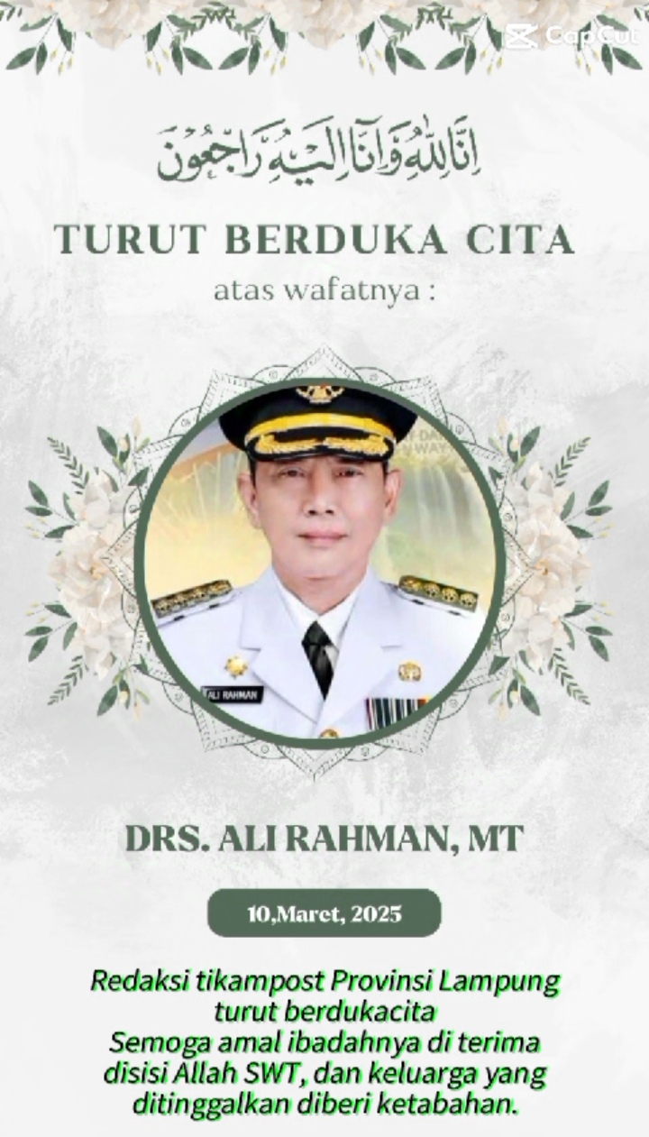 Turut berdukacita atas berpulangnya almarhum bapak bupati Waykanan Drs. H Ali Rahman MT. semoga amal ibadahnya diterima oleh Allah SWT, dan keluarga yang di tinggalkan di berikan ketabahan. Serta almarhum di tempatkan di sisinya serta di kumpulkan bersama hamba hambaNya”.